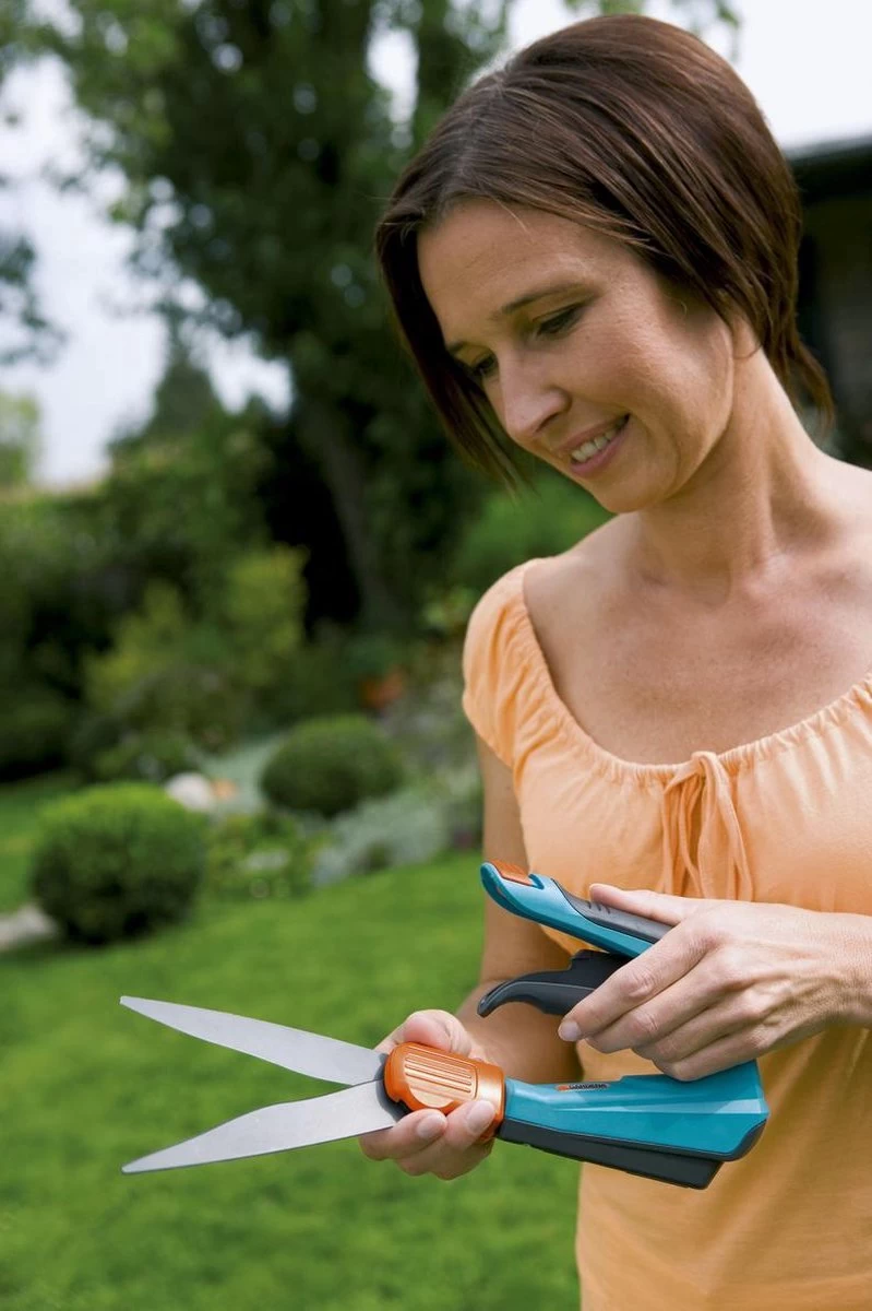 Ook niet-toegankelijk plekken in de tuin zijn bereikbaar. De speciale vorm van de handgreep met gepatenteerde, optimale krachttoepassing zorgt dat u de graskanten extra gemakkelijk kunt bijwerken, met de beste ergonomie in elke situatie. Door het draaimechanisme van 360° kunnen zowel linkshandige als rechtshandige mensen comfortabel werken. De prettige hantering wordt gegarandeerd door de elementen van zacht kunststof. De messen met antikleefcoating en golfsnede zorgen dat u nauwkeurig en op een consistente hoogte kunt snoeien. Dankzij de speciale gelagerde messen kunt u gelijkmatig en krachtig snoeien over de volledige lengte van het mes. De geleiders zorgen voor gemakkelijke begeleiding en een consistente snoeihoogte. U kunt de grasschaar snel en eenvoudig vergrendelen met de praktische enkelhandige vergrendeling.