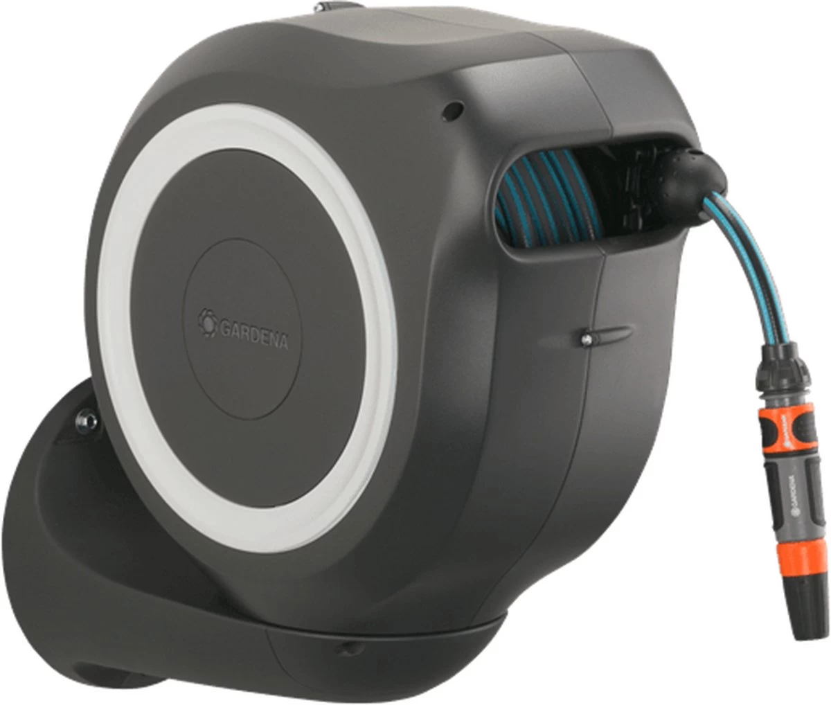 Met de Gardena wandslanghouder RollUp M is de tuinslang direct klaar voor gebruik en na het sproeien snel weer op te bergen zonder in de knoop te raken, beschermd tegen vuil en beschadigingen. Met korte vergrendelingsstops kan de slang tot op de gewenste lengte worden uitgetrokken. Dankzij RollControl is een korte trek aan de slang voldoende om hem automatisch en met een gelijkmatige snelheid veilig weer op te rollen. De wandhouder is meer dan 180° zwenkbaar, met praktische houder voor het opbergen van Gardena spuiten of broezen. De wandslanghouder is vorstbestendig. Met 20 m kwaliteitsslang (11 mm), flexibele aansluitslang, Original Gardena System onderdelen en spuit. Inclusief wandhouder met schroeven, pluggen en montagehulp. Met diefstalbeveiliging.