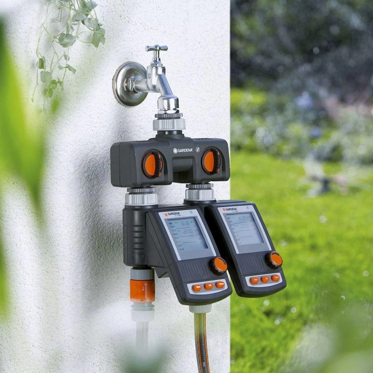 Met de Gardena 2-weg-waterverdeler kunt u gelijktijdig twee accessoires aansluiten op één kraan. De uitgangen zijn traploos regelbaar. Op de verdeler kunnen twee Gardena besproeiingscomputers of watertimers worden aangesloten. De 2-weg-waterverdeler kan met het Prof-System kraanstuk (art.nr. 2801-20) worden omgezet in het Gardena Prof-System voor een grotere waterdoorvoer. De Gardena 2-weg-waterverdeler is geschikt voor 26,5 mm -waterkraan met en 33,3 mm -draad en 21 mm -waterkraan met 26,5 mm -draad.
