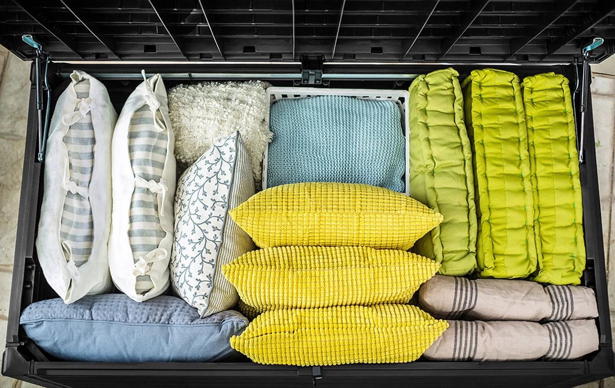 In de zeer ruime Keter Ontario Opbergbox 870 liter passen al je tuinkussens, inclusief die van de loungeset. De kussens liggen er goed in opgeborgen en worden niet nat. Bovendien kan de opbergbox worden afgesloten met een hangslot (niet meegeleverd). De box heeft een elegante houtlook en vormt zo een eyecatcher in iedere tuin. Hij is gemaakt van duurzaam kunststof en daardoor weerbestendig. Het deksel is voorzien van gasveren waardoor hij makkelijk open en dicht gaat.
