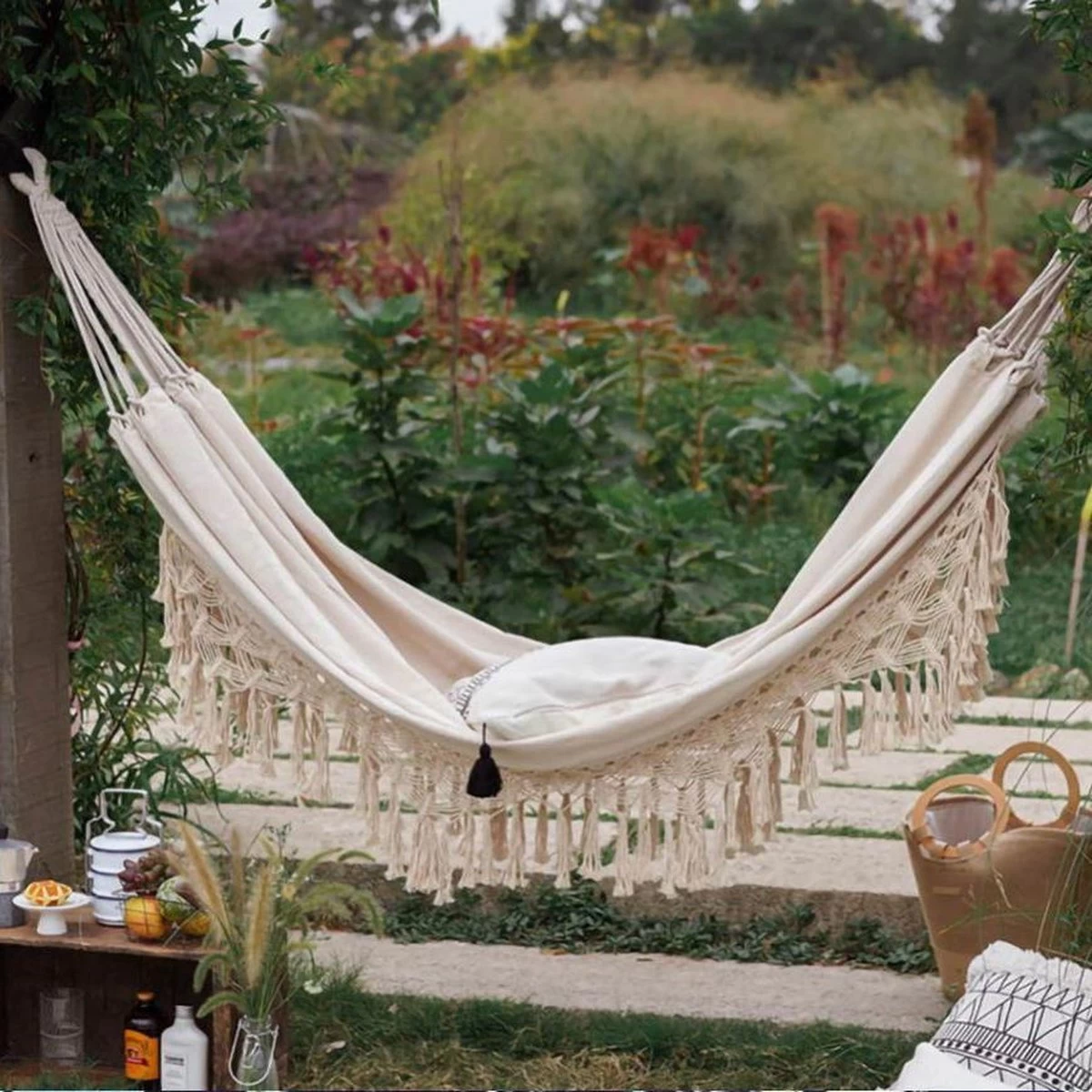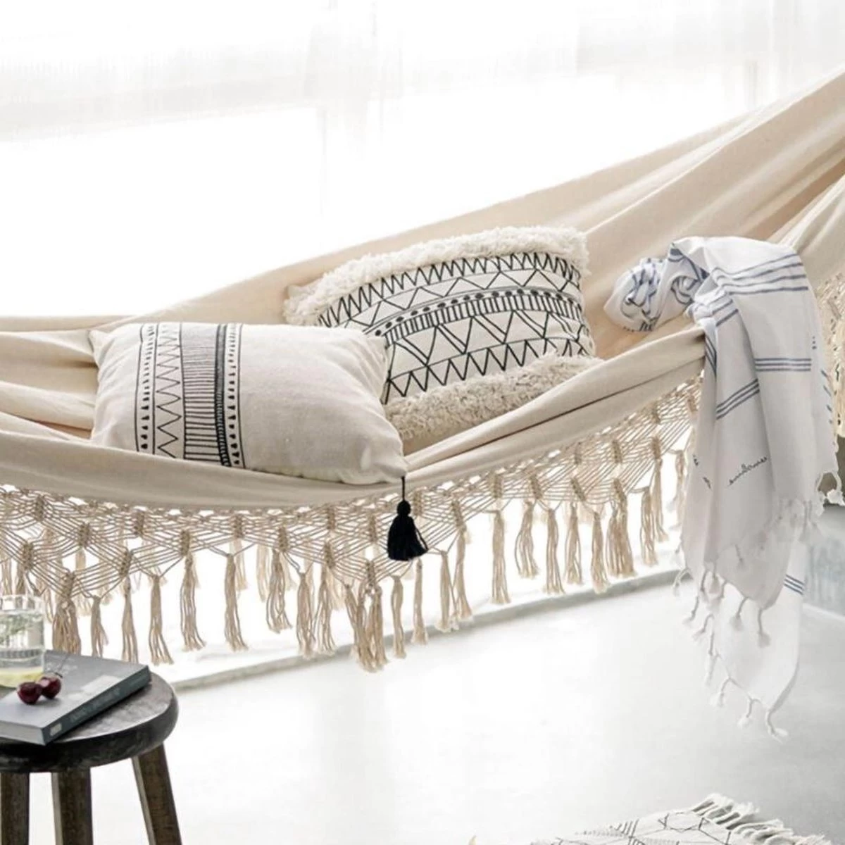 Zit je liever buiten in de natuur? Hang deze gadget dan in je tuin: aan een grote boom of onder een afdak. Creëer jouw eigen bohemian tuin met deze hangmat en nog andere boho-chic tuinaccessoires. Je waant je vast en zeker in betere oorden met deze gadget in jouw tuin. Of organiseer een echt cocooning feestje en vervang die saaie tuinstoelen door deze aangenamere, hangmat. Beter comfort gegarandeerd!