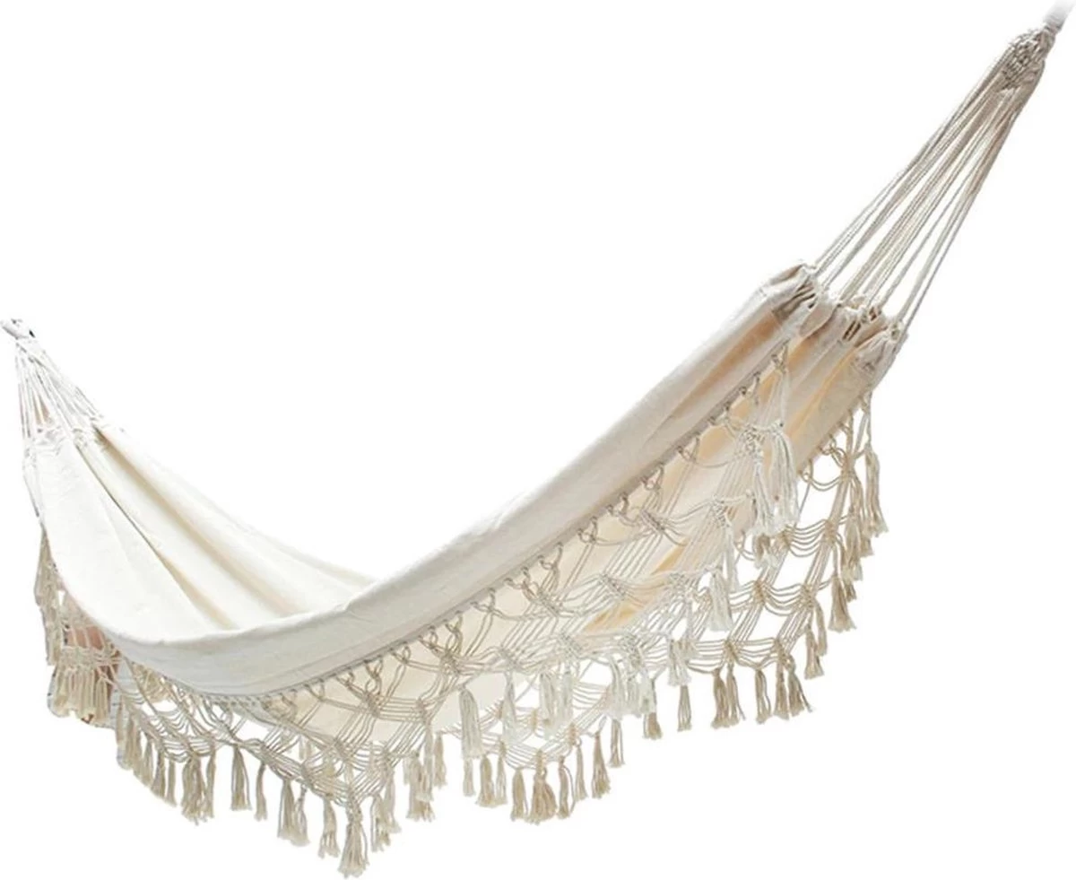 Dit artikel komt in gebroken wit. Het doek bestaat volledig uit katoen en heeft een draagkracht van 250 kg. De totale lengte van de hangmat is 280 cm, het liggedeelte is 180 cm lang en 150 cm breed.